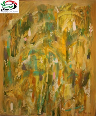 في هذه المجموعة حضرت النباتات وحدها من غير شخوص، إلا في لوحة واحدة ظهر فيها حصان بين النباتات، حتى أني شعرت أن اللوحات تسأل عن زوارها، فاللوحة الأولى، بألوانها الذهبية والضياء الصاعد وكأنه من القمح في موسم الحصاد، أظهرت خيولًا شامخة في الثلث الأعلى، وكأنها بديل رمزي للإنسان. فالعلاقة مع الطبيعة ليست حكرًا على البشر، بل تشمل جميع الكائنات. اللون الأخضر رمز الخصب، والأزرق والأبيض ألوان صفاء، فجاءت اللوحة إشارة واضحة لعطاء الطبيعة وتجدد الحياة. ومن خلال هذا التكوين اللوني الذي يرتبط بلون القمح في موعد الحصاد تحت الشمس، نجد الخيول في الثلث الأعلى من اللوحة، وقد تكون الخيول جواد وفرس، والأغلب فرس ومهرة من حيث التدقيق بالأحجام، فهنا استبدلت الفنانة الانسان بالخيل، في اشارة رمزية أن دورة الحياة والعلاقة مع الطبيعة تشمل كل الأحياء، فالخيول عشبية الغذاء وهذا ما يربطها بالأرض والنباتات بقوة، مما يجعل من اللوحة اشارة واضحة لعطاء الطبيعة وجمالها، وقد تمازج اللوحة بألوان الأخضر رمز الخصب، وتوشيحات من الأزرق والأبيض وألوان فرحة أخرى، في ايقاع بصري من خلال التكوين اللوني، وضربات الفرشاة للألوان بتدفق جميل وإنسيابية بدون انسيالات لونية أو بثور، فأصبحت لوحة قابلة للتأويل بأكثر من اتجاه من خلال الكتلة واللون، فكانت اللوحة أشبه بتدفق النور بين سنابل الحقول، في اشارة واضحة يراها المشاهد لتجدد الحياة وعدم خلودها للسكون، في علاقة واضحة بين اللون والضوء وما اختزنته تلافيف الذاكرة عبر حياتها من مشاهد بصرية.
