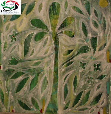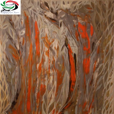 أما لوحة ثانية فقد اعتمدت أسلوب التجريد العضوي (Organic Abstraction)، حيث تتشابك الأغصان والألوان بإيحاءات نارية توحي بصراع بين الحياة والموت. الألوان الرمادية واللون الرملي والمتعارف عليه باللون "البيج" وهي كلمة فرنسية، وتوشيحات الأحمر والبرتقالي والأسود والأبيض، وتوشيحات الأحمر والبرتقالي والأسود، مع تكوينات طولية وحلزونية، أعطت انطباعًا بجدلية النور والعتمة، والحياة والفناء. بالاعتماد على الرمزية في عناصر من الطبيعة، مستفيدة من المساحات اللونية التي تضم الأغصان والنباتات، تاركة للمتأمل أن يتخيل ويأول رموز اللوحة، من خلال التشابك بين الخطوط والألوان، وخاصة مع غلبة اللون الرمادي على خلفية اللوحة وتكوين الخطوط الطولية ككل اللوحات، اضافة للتموجات اللونية في الخطوط المنحنية. وهذا التكوين الحركي المتصاعد للأعلى واللوني للوحة جعلها قريبة للزخرفة، ومن خلال اللون الاحمر القاني والبرتقالي في مقدمة اللوحة، وهي ألوان حارة مقابل خلفية اللوحة باللون الرمادي، يشعر المتأمل أن هناك صراع بين النور والعتمة والموت والحياة.