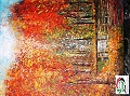 في اللوحة الأولى عن الطبيعة نرى مشهد لغابة من الأشجار التي تتشح باللون البرتقالي بصفة عامة متمازجاً مع ألوان فرحة أخرى مثل الأصفر والأخضر والأبيض، تحيط بتجمع مائي مياهه هادئة ساكنة، تنعكس عليها ألوان الشجر الملونة، والتي تبعث الفرح في نفس المتأمل وتمنحه هدوءاً وسكينة، وفي أعلى اللوحة نرى أطراف السماء مع توشيحات بيضاء للغيوم، وفي وسط اللوحة تماماً تلجأ الفنانة لزيادة اللون الأبيض محدثة نوعاً من الانفراج بين شجرتين والكثافة خلفها، فتظهر وكأنها طريق تصعد للسماء معتمدة بشكل جميل على انعكاسات الضوء بدون ظهور الشمس بوضوح، ويلاحظ أنها لجأت، أيضاً، لوجود بؤرتي رؤية في اللوحة الأولى في الوسط، وانطلقت منها لباقي اللوحة بشكل حلزوني، والثانية في أسفل السماء فوق أعالي الأشجار، ومنها تحركت بريشتها نحو الأسفل، وهذا الأسلوب في استخدام انعكاسات الشمس نجدها تحرص عليه في العديد من اللوحات الانطباعية المرتبطة بالطبيعة، وفي معظم اللوحات نجد أن المياه على شكل مسطحات أو جداول موجودة ومتمازجة مع الطبيعة وكثافة الأشجار، ما يمنح اللوحات جماليات خاصة وشكلاً تأثرياً بالطبيعة ما بين غابات حرجية وأشجار ملونة ومسطحات الماء الهادئة دوماً في لوحاتها.