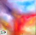 اللوحة الرابعة، فيها أسلوب مختلف تماماً عن الأساليب السابقة، فهي لوحة لونية تثير في الروح التساؤلات العديدة، فليس من شيء واضح كشكل فيها، وهي أقرب إلى رمزية لونية تعكس ما كان يجول في الروح حين نزفتها بالفرشاة واللون، وفي هذه اللوحة كان اللون الأحمر بتدريجاته مع تمازج اللون البرتقالي والأصفر والأبيض يأخذ ربع اللوحة، وهو ينطلق من منتصف اللوحة اليمين بالنسبة للمشاهد، ومن منتصف أسفلها حتى يصبح أشبه برأس لامرأة ترتدي رداءً أحمر، أو كتل غيمية حمراء، وخلف الشكل المشابه للرأس نجد فجوة من اللون الأزرق الغامق بشكل طولي يتجه للزاوية العليا المقابلة، وهي أشبه بكتلة سديمية أو مجرة، ونلاحظ هنا أن هذه المنطقة تمثل بؤرة اللوحة، ومنها تبدأ الحركة الحلزونية حتى تتحول الألوان من الغامقة إلى الفاتحة، تبدأ بالانتشار باللون البنفسجي بتدريجاته من الغامق للفاتح وصولاً إلى الأزرق الموشح بالأبيض في يمين اللوحة العلوي، يقابله في يسار اللوحة السفلي الأحمر الذي يتحول للبياض، وفعلياً شعرت كم أن الوقوف أمام هذه اللوحة يخلق حالة من الإثارة أولاً، ليتحول الشعور إلى سكينة وهدوء وسؤال أيضاً.