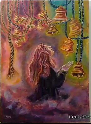 تحيطُ بالفتاةِ مجموعةٌ منَ الأجراسِ المتدلّيةِ كتدلّي أمنياتها من عريشةِ الرّوحِ الذّابلةِ إلى ينابيعَ الفرحِ، عدا عن وجود حبلٍ خلف اليافعةِ دونما جرسٍ، تُركَ متدلِّيًا بحريَّةٍ، هو حبلُ الرَّجاءِ، ورمزُ الخلاصِ المرجوِّ