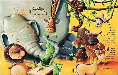 قصة يوم الِانتخابات في سابانا، تأليف الكاتبة الفرنسية ساندرين دوماس رو، رسومات برونو روبرت، اصدار مؤسسة تامر للتعليم المجتمعي، 2007، الترجمة عن الفرنسية وليد أبو بكر. تتحدث القصة عن معركة انتخابية حامية الوطيس، في غابة سابانا، لانتخاب ملك الغابة، أربعة من المرشحين اعتلوا الحلبة السياسية ليخوضوا المعركة الانتخابية، كان الأسد"جو"أحد أبرز المرشحين، لإعادة انتخابه ملكا للغابة، لم يكن قلقا، منذ زمن بعيد والأسود تعتلي عرش الغابة دون منازع، أما الفيل"بيل"كان صديقا للجميع وفي الأسابيع الأخيرة كثف من زيارته المكوكية للمجاملة، والزرافة كانت تعتقد انها الأنسب لهذا المنصب، هي تشاهد قدوم الأعداء من بعيد لتحذر القوم، والتمساح الذي يحلم بالعظمة والفخامة، أصبح نباتيا بمساعدة خبير في الحمية الغذائية، وقد نشرت العصافير الخبر في الغابة وانتشر كانتشار النار في الهشيم،"التمساح جو لا يأكل أكثر من ليمونة"، وعند شجرة الباوباب الضحمة، عقدت مناظرة بين المرشحين الأربعة، زأر الأسد جو وقال: لن أكون اقل من والدي، الزرافة جيبيت صرحت"سأكون ضالتكم لتركضوا معي حتى نتجنب الخطر"، وصرح الفيل بيل"سوف نعيش مجموعات متوافقة ومنسجمة"، أما التمساح صرح"سوف أضع أنيابي في خدمتكم ضد من يهاجمكم"وعندها ارتفعت صيحات الجماهير"أنياب التمساح وعد للجميع"، شعر بقية المرشحين بالغيرة والامتعاض من التمساح وصرحوا انه متملق ومراوغ ولن يسمحوا له بالوصول إلى كرسي ملك الغابة، في النهاية جاء اليوم الموعود،اليوم العظيم، قام النمل بجرد وفرز الأصوات، والتمساح جيم جاء على رأس القائمة، تضايق الأسد"جو"فهذا الأمر لم يحدث يوما في سجلات سابانا، خسر ارث الآباء والأجداد ونال صفعة قوية لم يحسب لها أي حساب مسبق، خرج من الحلبة السياسية صفر اليدين، أما التمساح جيم، فكان مسرورا بما حصد من نجاح وفوز، ابتسم وهو يبرز أسنانه البيضاء، وخطب خطابا مقتضبا بالجموع، ليبث السكينة في قلوبهم، في اليوم الأول وزع الحقائب الوزارية على أفراد عائلته من التماسيح، وأصدر أمرا ملكيا بتشديد الحراسة على الحدود، على يد الشباب من التماسيح،وقد أعجب حتى الذين لم يتشجعوا لِانتخابه بجديته فهو ينفذ الوعود بحذافيرها ويوفر الأمان، واستراح الملك في مستنقعه لا يحرك ساكنا، وعندما جفت مياه الجداول في الغابة، حاولت الحيوانات اجتياز الحدود للبحث عن المياه لتنقذ أرواحها، لكن الجنود التماسيح حرس الحدود، قاموا بصدهم بغلاظة، ولم يرق قلبهم لتوسلاتهم، في تلك الليلة حاولت بعض الحيوانات التسلل خلسة لتمنع عنها الموت المحقق، وكان من بينها الغزال، لكنه أصبح لقمة سائغة في أفواه التماسيح، عندها انتشر الخبر سريعا، الملك نباتي لكن اخوته وأقاربه ليسوا كذلك، لا بد من تنظيم ثورة تطيح بالملك وزمرته وعائلته المالكة، لا بد من طرد الملك القاسي، ومن يوم إلى يوم، أصبحت قوة الحيوانات خائرة، والأمور تزيد تعقيدا، اجتمعت الحيوانات، واقترح الفيل بيل،إقامة احتفال للملك وللعائلة المالكة، ويقدم لهم أحد أنواع الفطر ويطهى جيدا، والتماسيح تحبه كثيرا، عندها يمكن تسميم التماسيح والتخلص منها، قام الفيل بدعوة التمساح، الذي قبل دعوة الفيل على أساس أن الاحتفال تقديم الشكر والعرفان له على حفظ الأمان، انقضت التماسيح على الوجبة تلتهمها، شعرت بالتخمة، وانها تطير من شدة الفرح، غادرت التماسيح المائدة، نحو الشاطئ الصخري، وطارت في الهواء وشعرت بلحظات العذاب، ودوت أصوات الحيوانات"أحسنا التصرف، وعلينا أن نختار جيدا هذه المرة، وتمت استعادة الحياة من جديد في غابة سابانا.