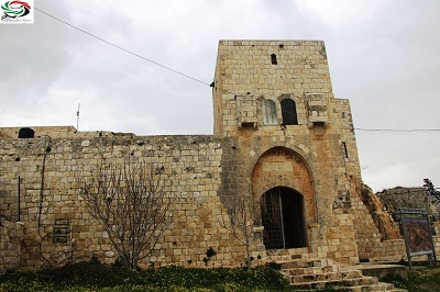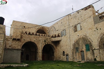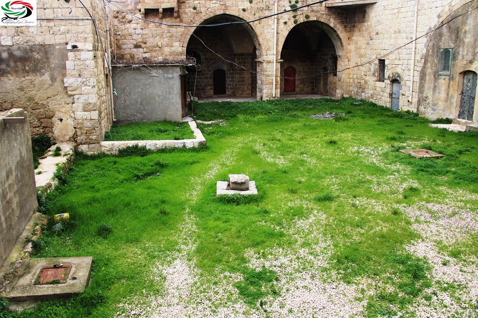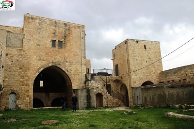 والبوابة جزء من جدار قوسي كبير ولكنها تدخل في هذا الجدار السميك جدا حوالي 35 سم من الداخل ومن الخارج، والحجارة اعلاها منقوش عليها الكثير من النقوش الرمزية الدالة على المكانة الاجتماعية والرسمية لصاحب القصر، والجدار المحيط بالقصر مرتفع عدة امتار ومن حجارة كبيرة وسمك كبير يحصن الموقع جيدا، وفوق البوابة "علية" لها نافذتان تسمحان بكشف من يأتي باتجاه القصر من البعيد، وكما نظام البناء المعتاد اعلى النوافذ على شكل أقواس ولكن بجوارهما من الجهتين بروز حجري للخارج واعتقد انه كان بها فتحات صغيرة واضح اثرها وإن اغلقت مع الزمن، وهذه الفتحات كانت تستخدم للدفاع عن القصر اذا اقترب أحد من الخصوم من بوابة القصر، وفي معظم القلاع والقصور الضخمة في جولاتي في فلسطين وخارجها كنت اشاهد هذه الأساليب الدفاعية، وفي السور المحيط بالقصر من الواجهة الأمامية نجد الفوهات الدفاعية في أعلى السور، وما ان عبرنا البوابة الى ساحة القصر حتى كنت اقف اتأمل ما اراه وأتخيل كيف كان، فمساحة القصر التراثي تبلغ 100×50 مترا، وفيه ساحة كبيرة تضم العديد من آبار المياه التي كانت تعتمد على الأمطار وتلبي حاجات من يسكنون القصر.