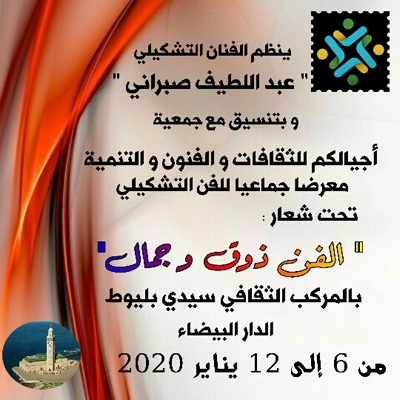 يحتضن المركب الثقافي سيدي بليوط بمدينة الدار البيضاء من 6 إلى 12 يناير 2020، معرضا للفن التشكيلي تحت شعار" الفن ذوق وجمال" ويشارك في هذا المعرض المنظم من طرف الفنان التشكيلي عبد اللطيف صبراني، بتنسيق مع جمعية أجيالكم للثقافات والفنون والتنمية، نخبة من أهم فناني الحركة التشكيلية المغربية المعاصرة، وينتمي الفنانون المشاركون إلى أجيال متعددة ومدارس فنية مختلفة، ويقدمون مجموعة من الأعمال الفنية المميزة في مجالات الرسم والتصوير وغيرها.
